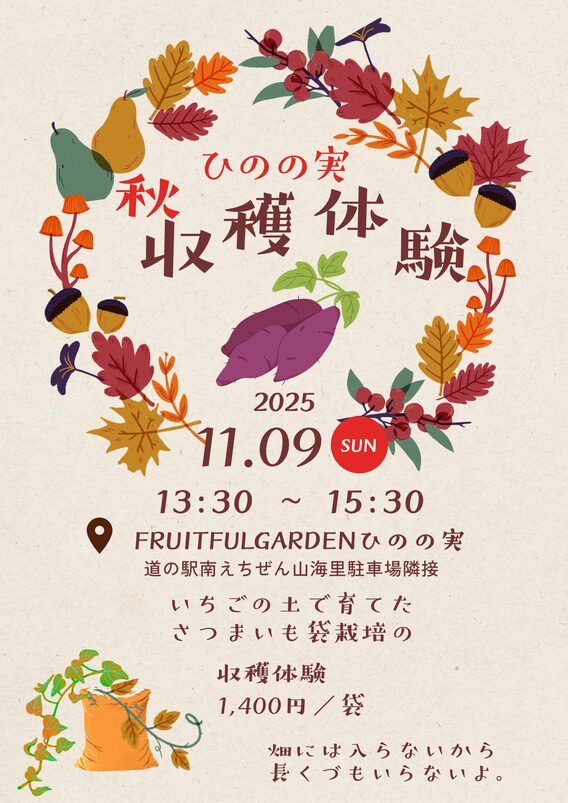 - 11月9日13:30~15:30 秋の収穫体験(さつまいも)